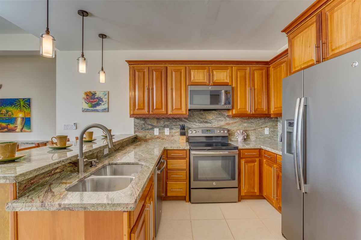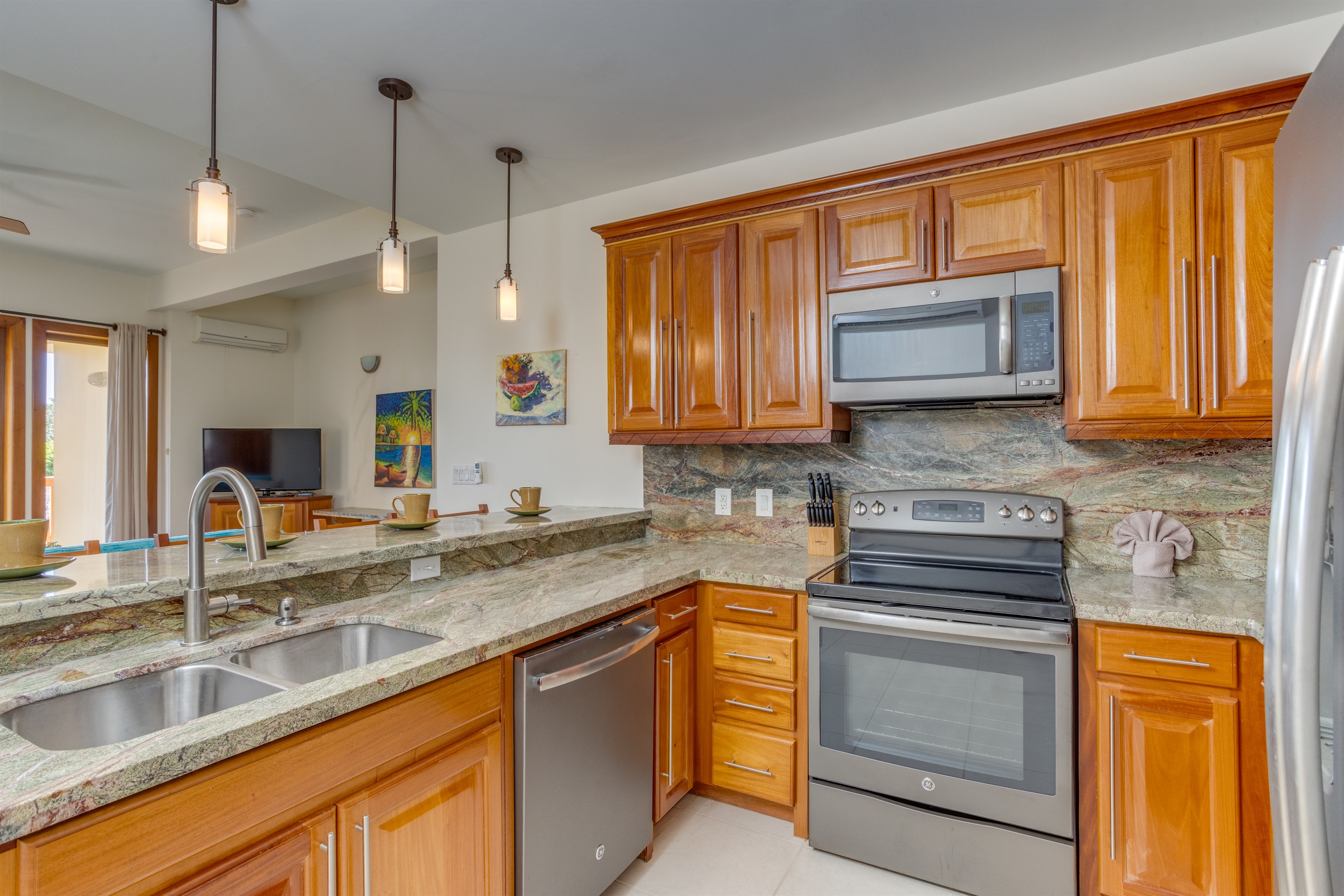 The interior features comfortable furnishings, a Smart TV, and complimentary high-speed Wi-Fi. The kitchen includes dark granite counters and matte steel appliances and is fully equipped for easy, self-catering vacation meals. Keep your packing light with a convenient in-unit washer/dryer.