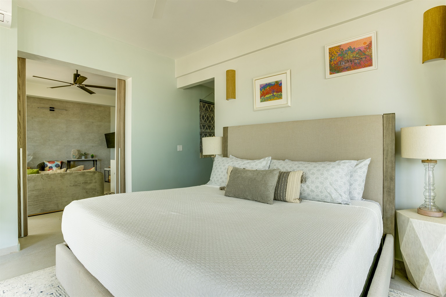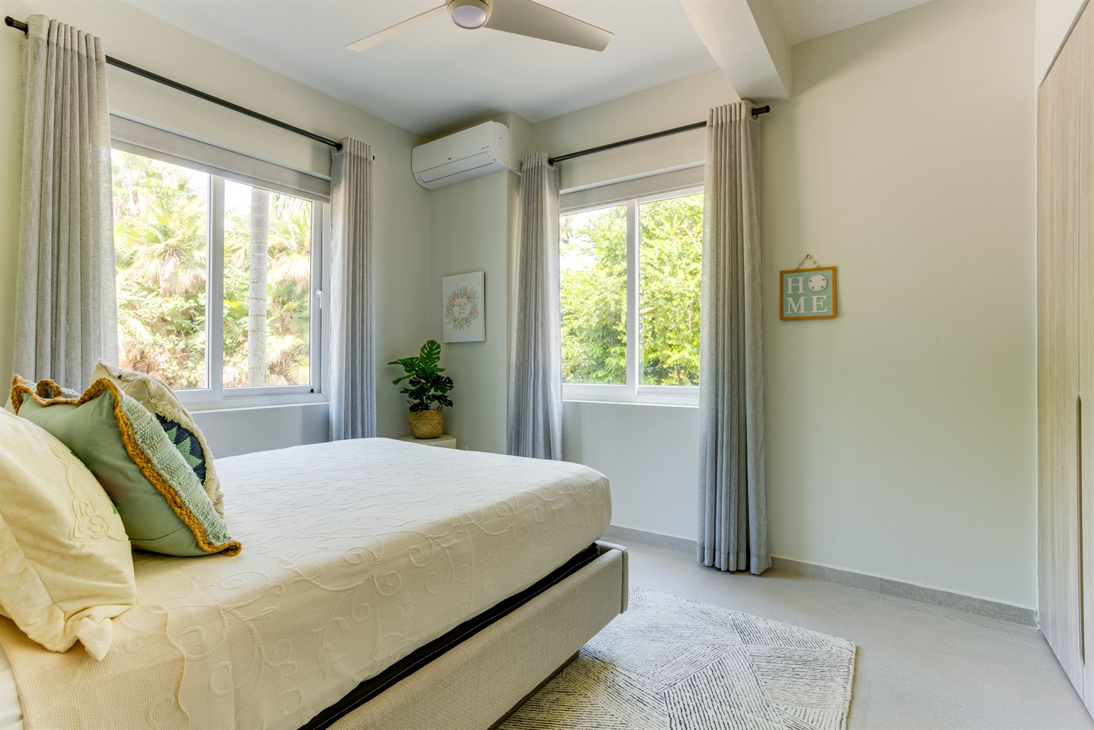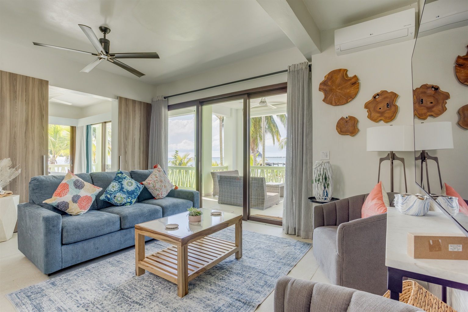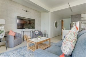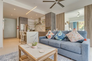 The Interior Experience: Inside, the open-concept living space is bathed in natural light, featuring high ceilings and coastal décor. The villa is fully air-conditioned. The full, well-equipped kitchen provides everything you need for easy meal preparation.