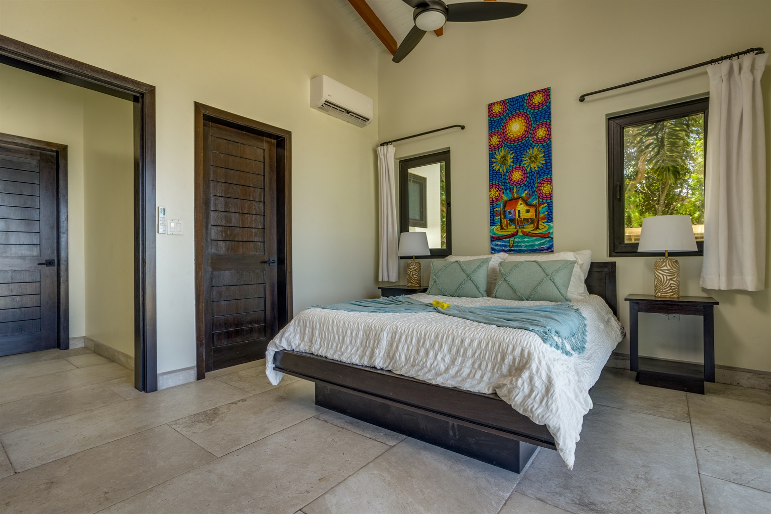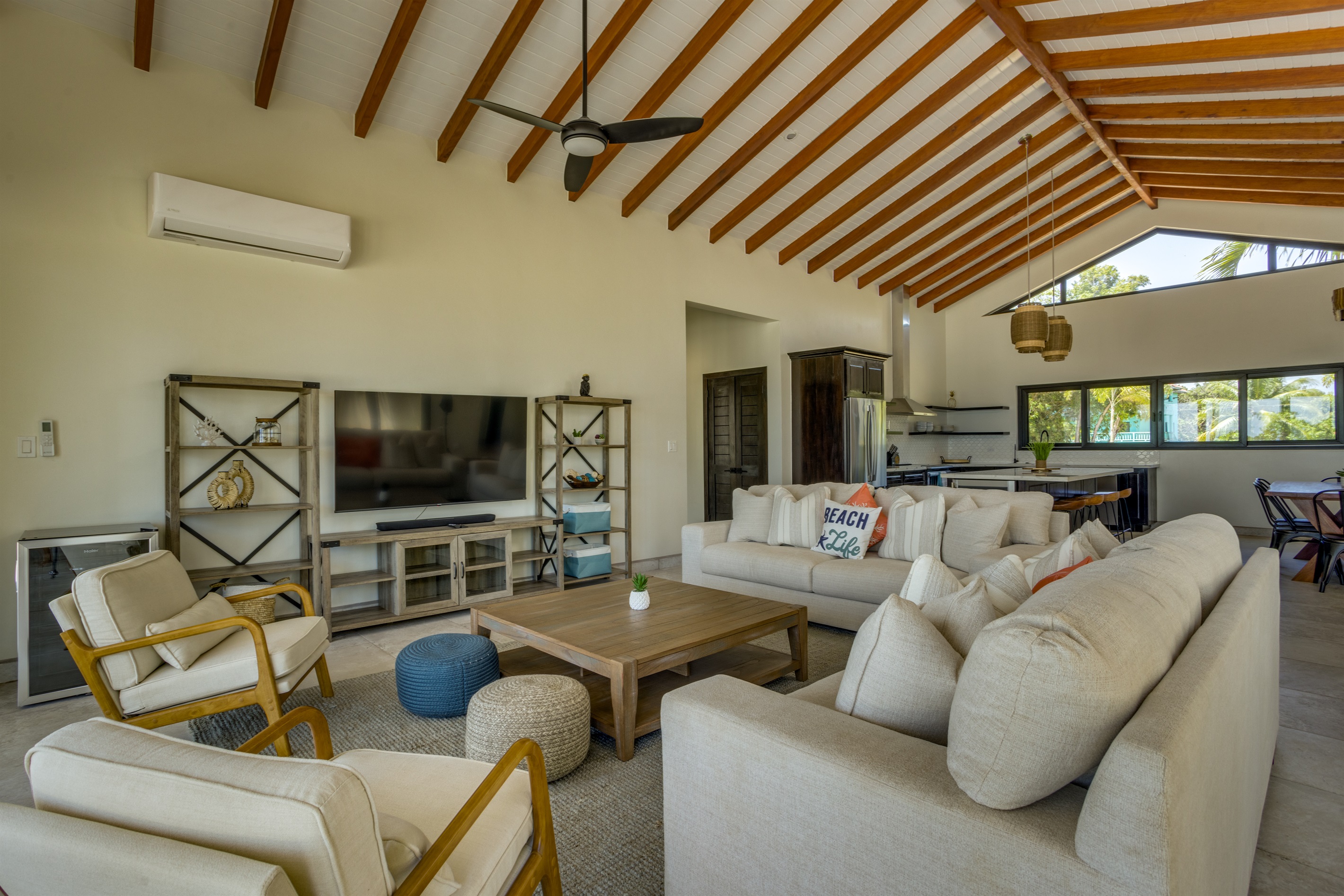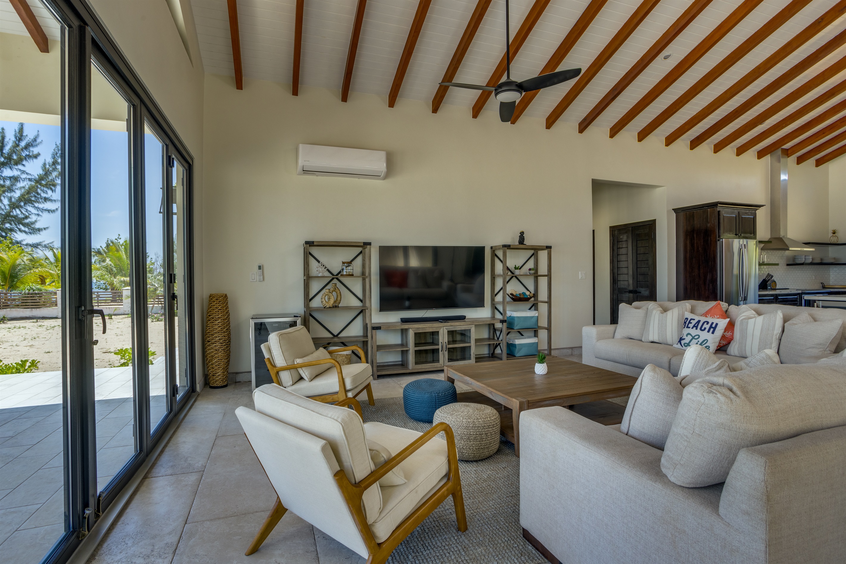 The villa features a spacious and fully air-conditioned interior, with the primary bedroom offering its own private ensuite bathroom for maximum comfort and privacy. The heart of the home is its expansive kitchen, equipped with top-of-the-line modern appliances, including a wine cooler, making it easy to whip up meals and enjoy a glass of wine as you soak in the tranquil atmosphere. The open-concept design flows seamlessly into the outdoor seating areas, perfect for dining al fresco or simply lounging while enjoying the Caribbean breeze.