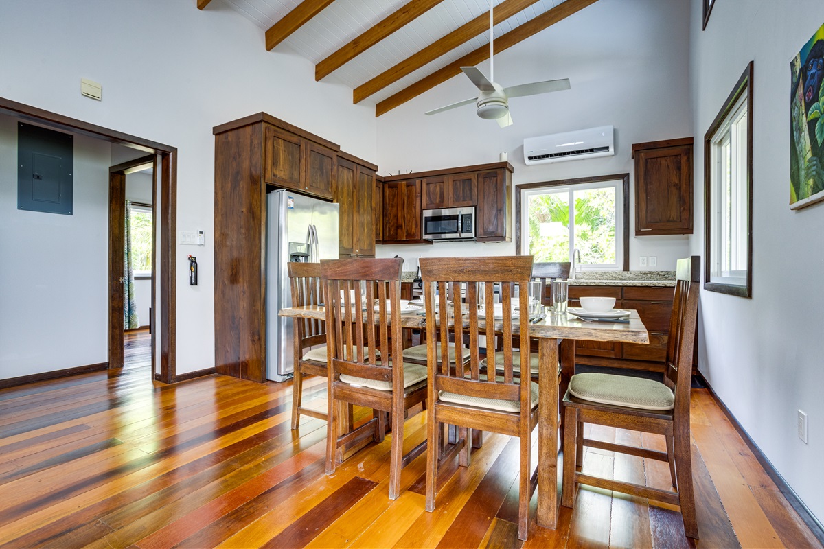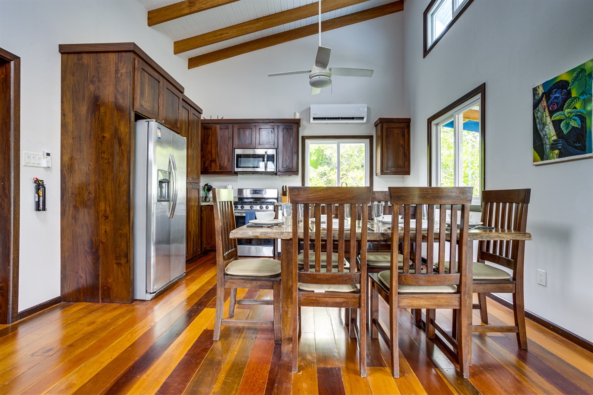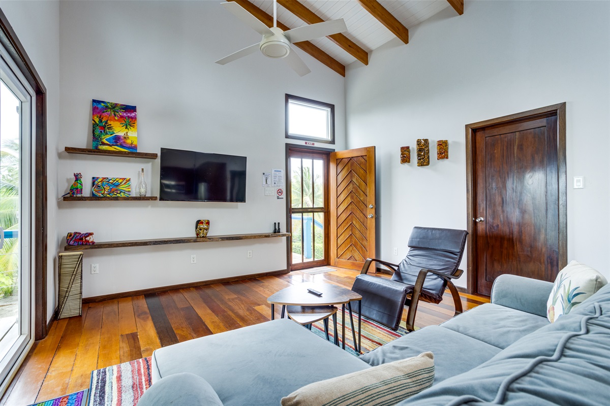 Inside, the home is as welcoming as its surroundings. The modern kitchen is a chef’s delight, equipped with all the appliances you need to prepare everything from simple snacks to gourmet meals. The open-plan living area is cooled by full air conditioning, ensuring your comfort no matter the time of year. After a day spent outdoors, unwind in the cozy living room, where you can enjoy your favorite movies or shows on the Roku smart TV. The strong internet connection allows you to stay connected, whether you need to check in with work or simply want to stream your favorite content.