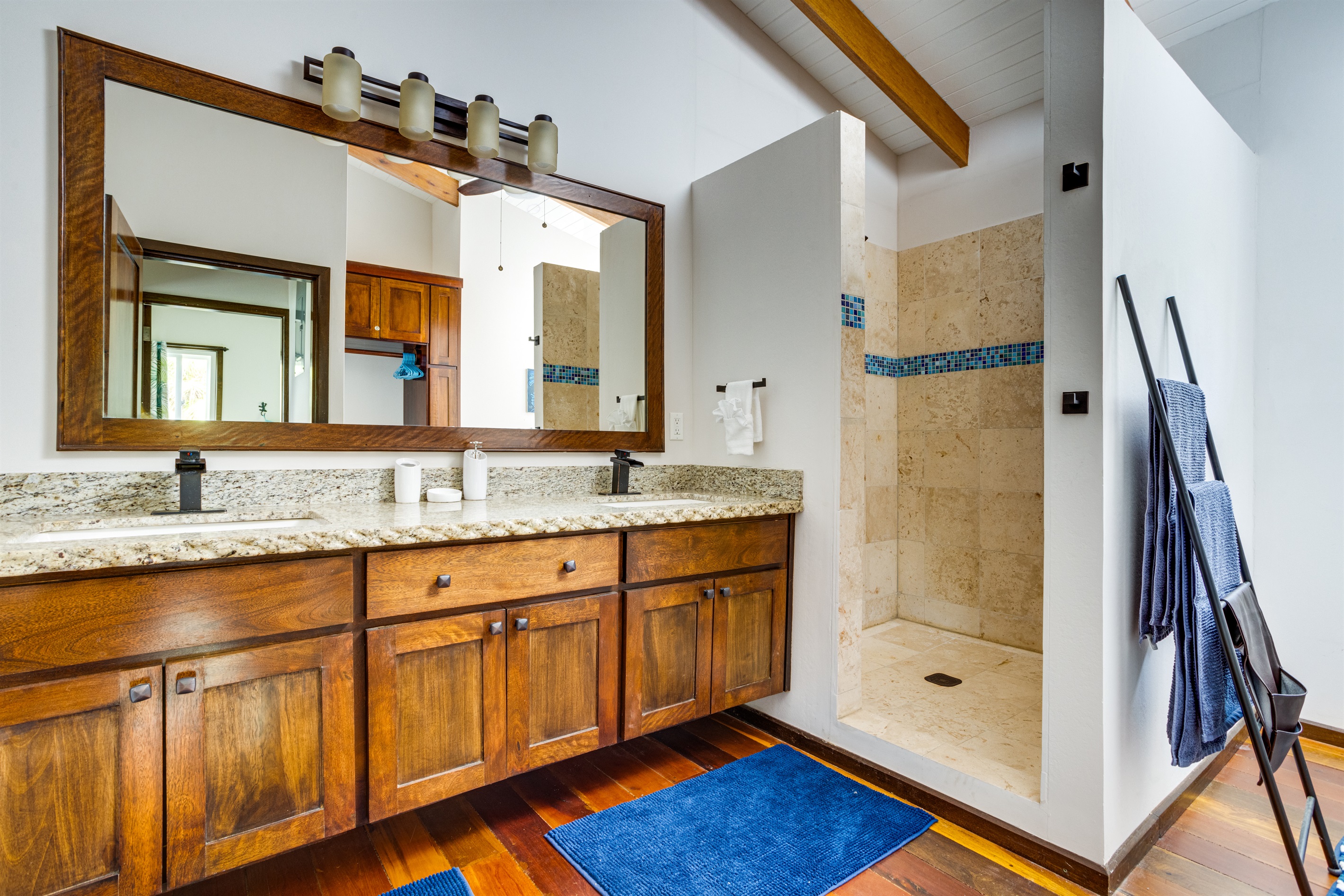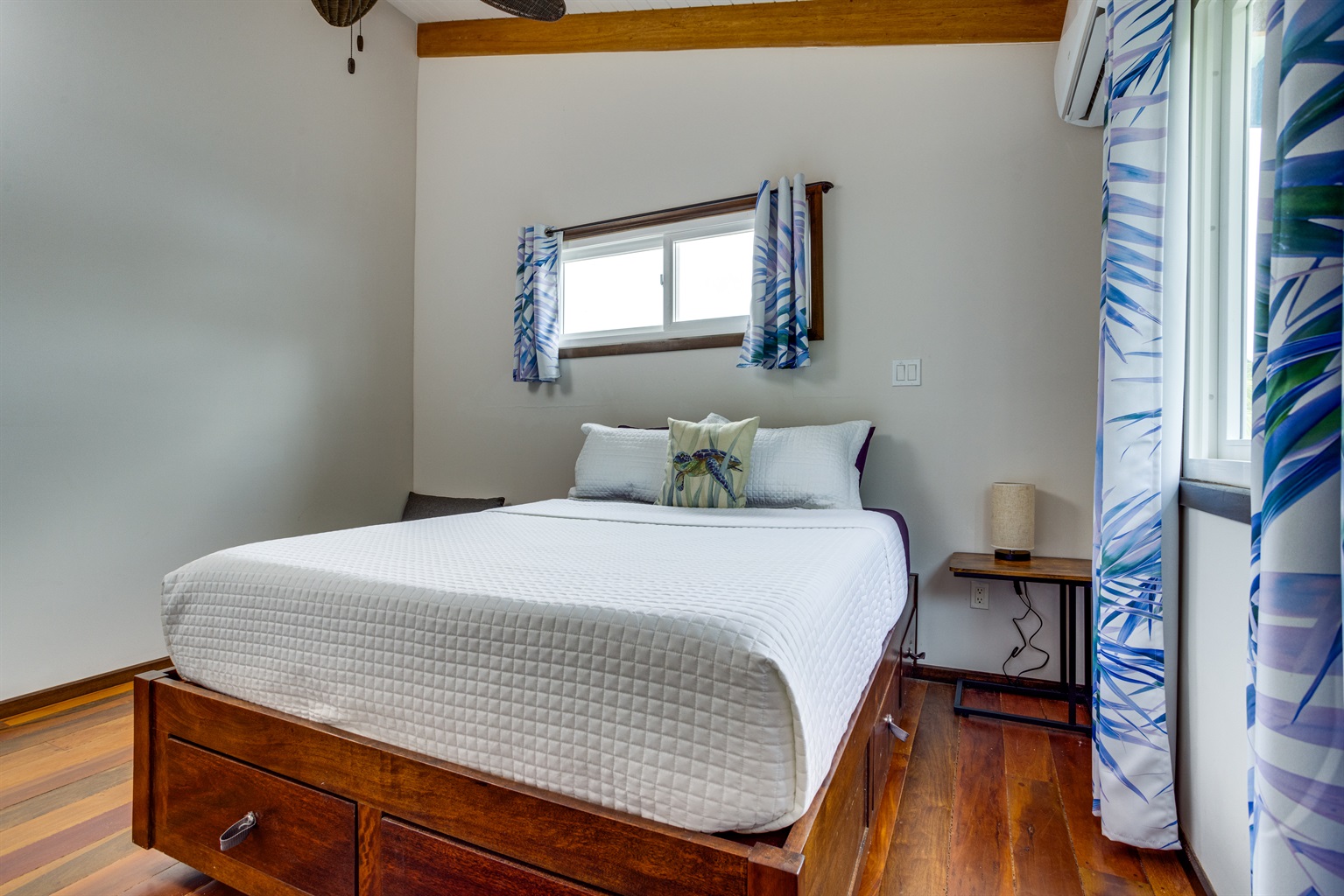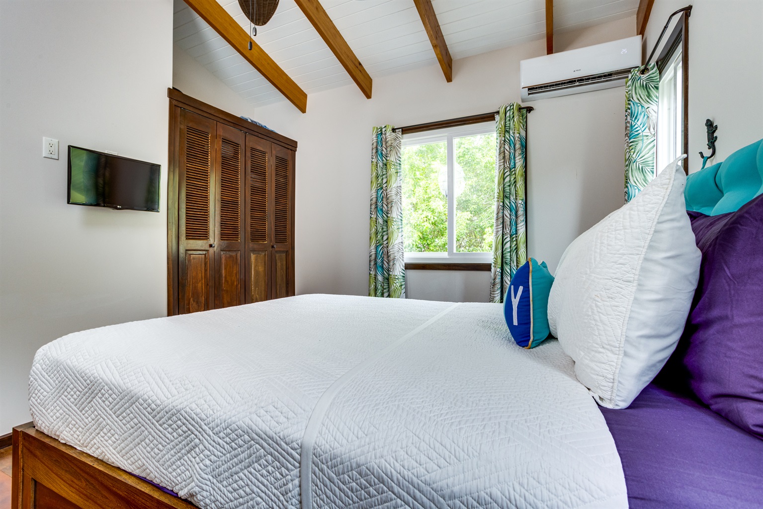 Inside, the home is as welcoming as its surroundings. The modern kitchen is a chef’s delight, equipped with all the appliances you need to prepare everything from simple snacks to gourmet meals. The open-plan living area is cooled by full air conditioning, ensuring your comfort no matter the time of year. After a day spent outdoors, unwind in the cozy living room, where you can enjoy your favorite movies or shows on the Roku smart TV. The strong internet connection allows you to stay connected, whether you need to check in with work or simply want to stream your favorite content.