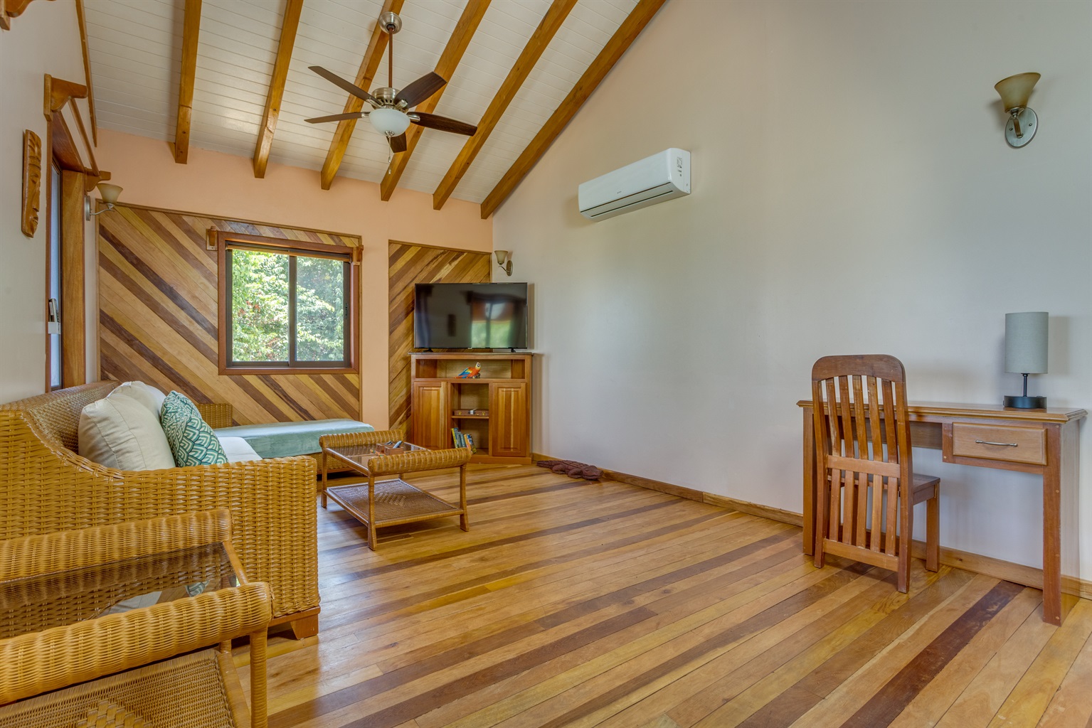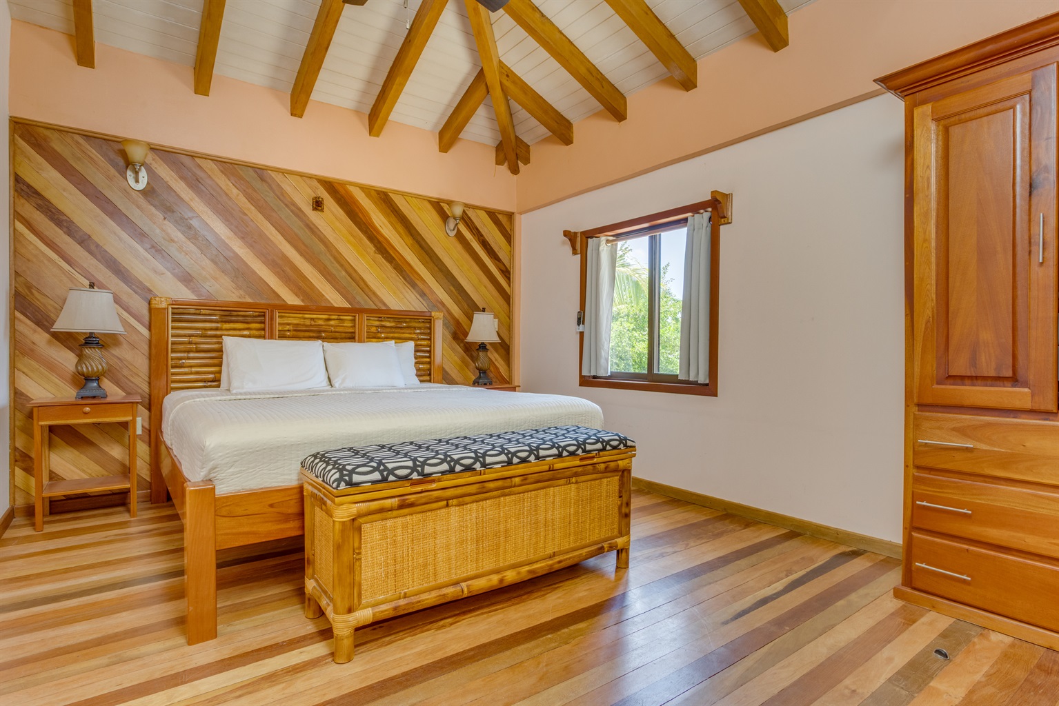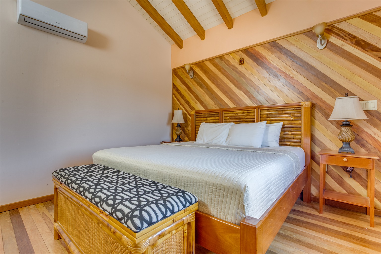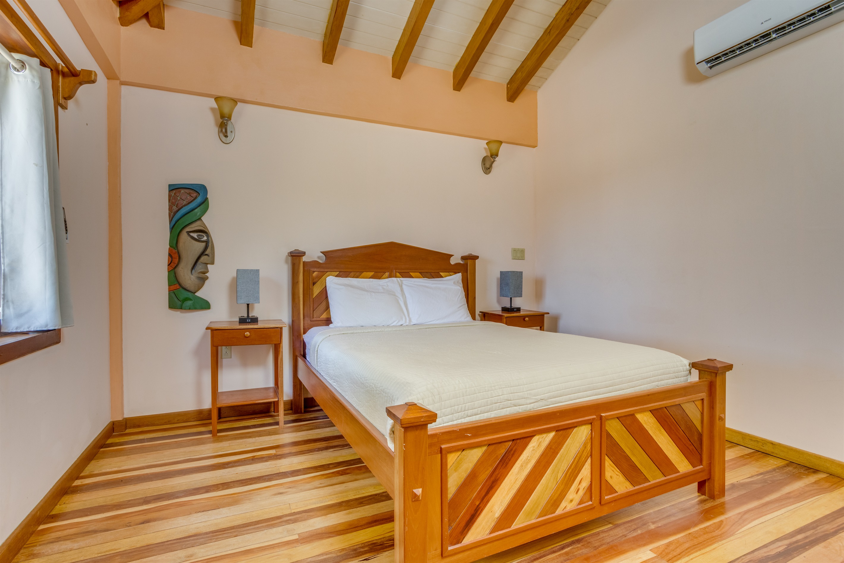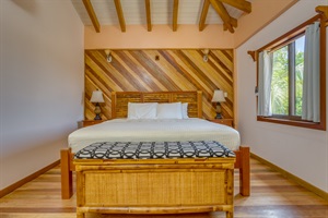 -Primary Bedroom (Upstairs): Features a luxurious king-sized bed, air conditioning, ceiling fan, and easy access to the upstairs bathroom.