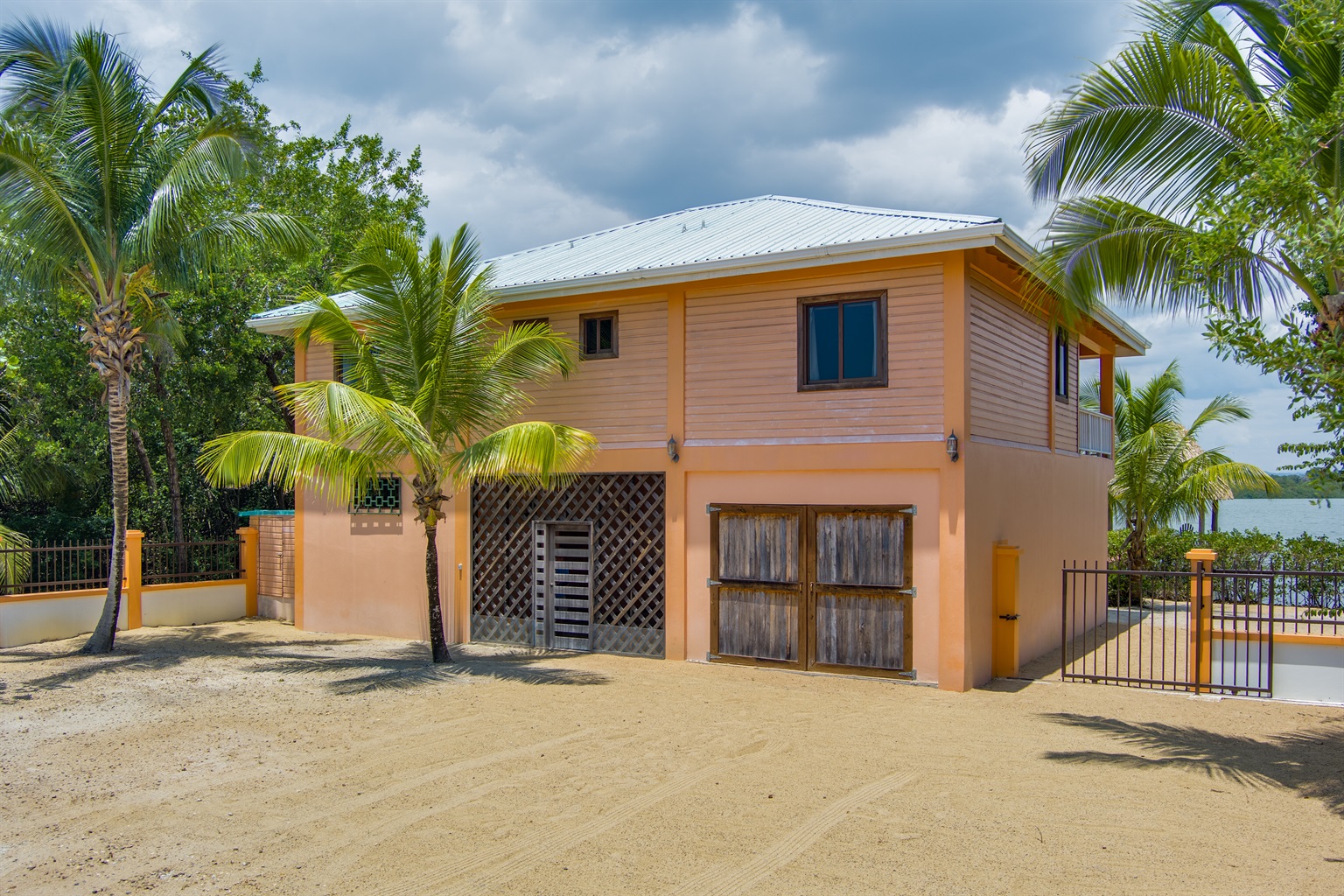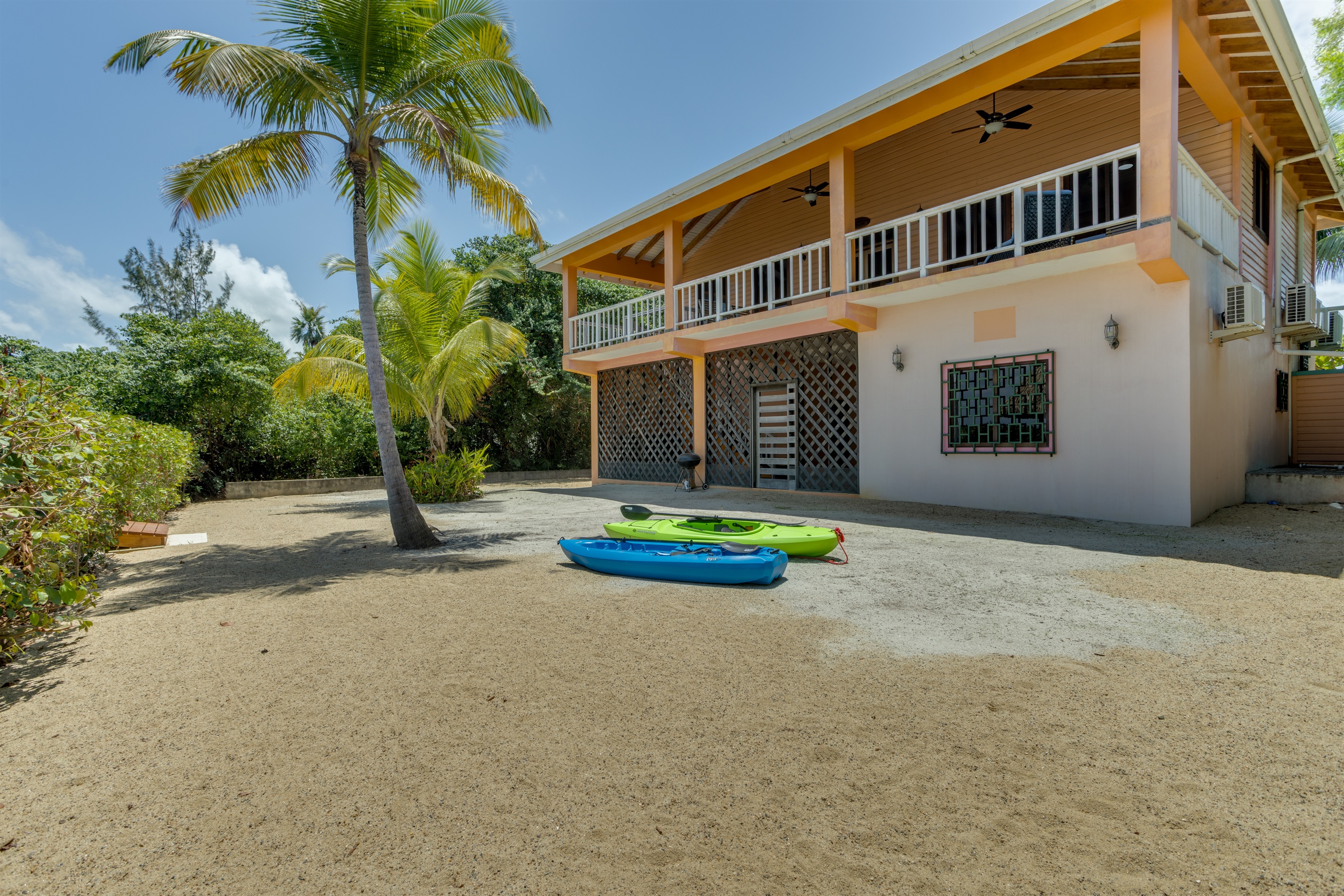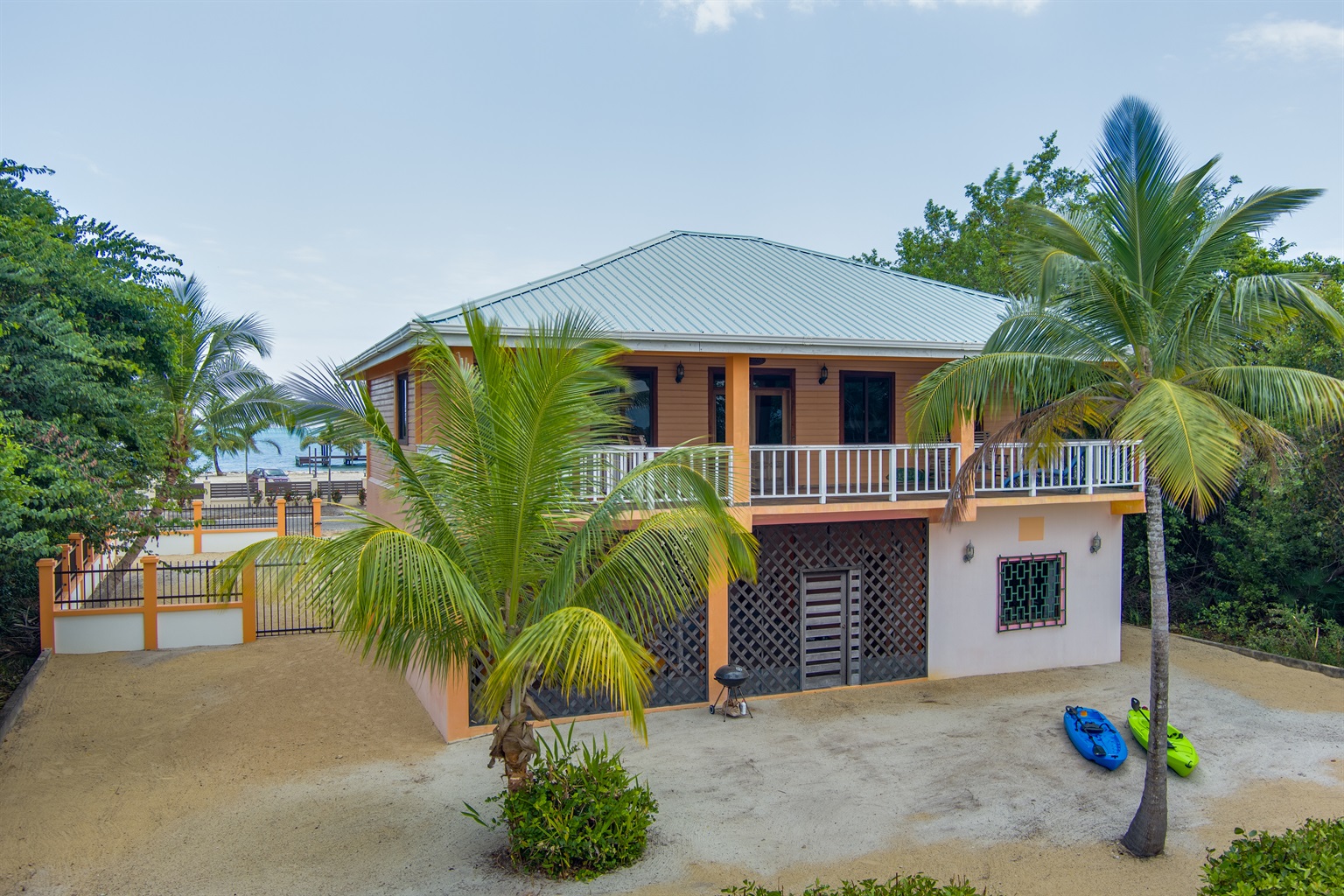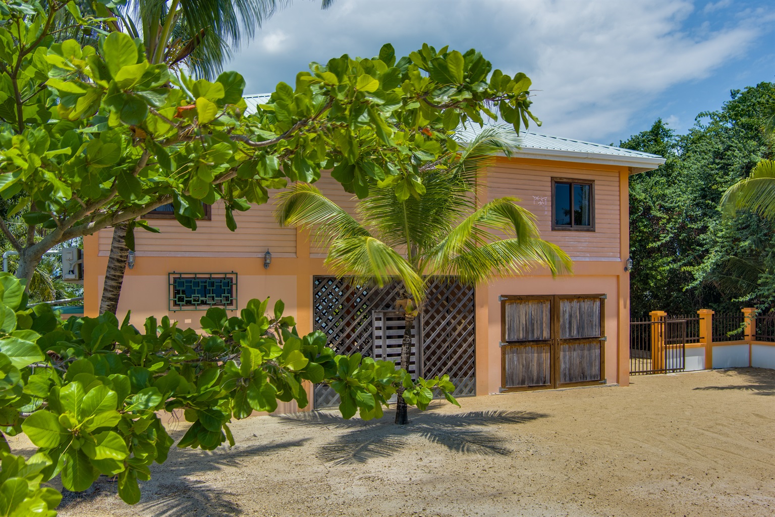 The large fenced yard with a remote-controlled gate provides privacy and peace of mind—perfect for families with children. Native hardwood floors and handcrafted Belizean wood furniture add a rich warmth and tropical charm throughout the home.