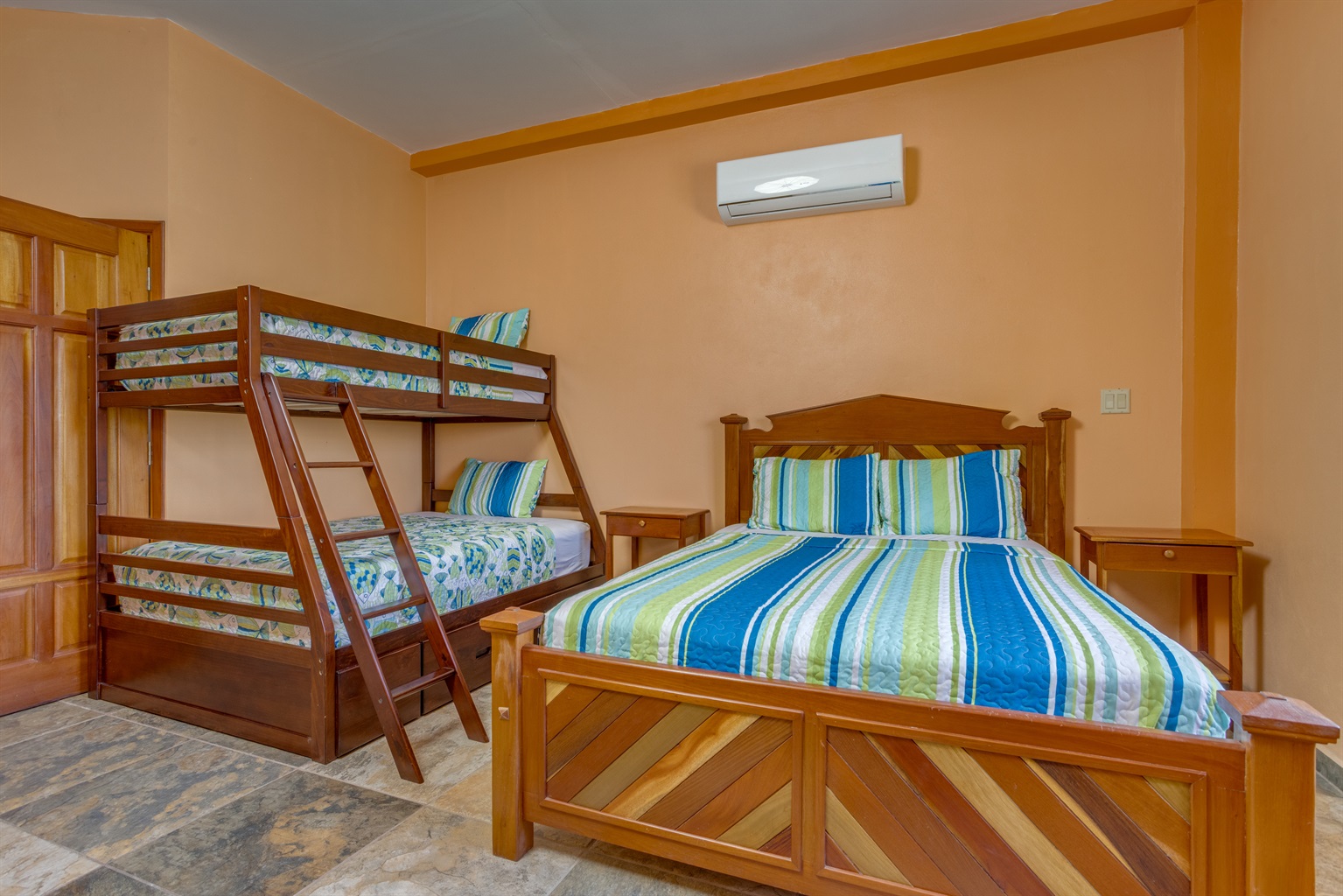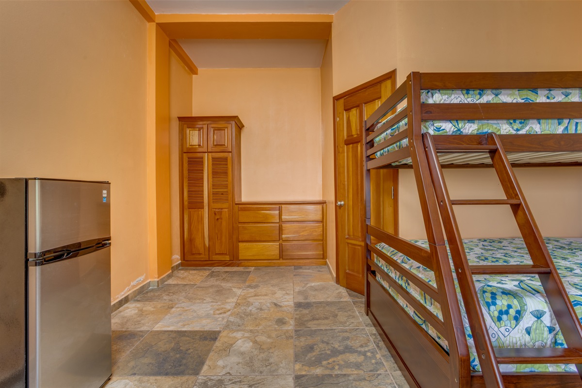 Downstairs Family Suite: A completely separate third bedroom downstairs sleeps five with a queen bed, full bed, and twin bed—perfect for kids, teens, or an additional family group. It offers privacy and its own entrance, giving everyone plenty of space to spread out. Also air conditioned.