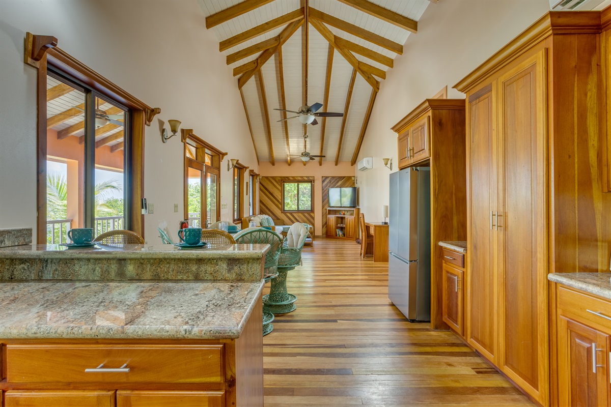 The upstairs living area features a spacious open-plan layout, with a **fully equipped kitchen** including a large refrigerator, stove, oven, microwave, blender, coffee maker, and all the dishes and cookware you’ll need. Whether you're preparing a family feast or quick beach snacks, you'll find everything right at your fingertips.