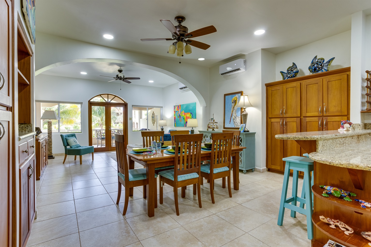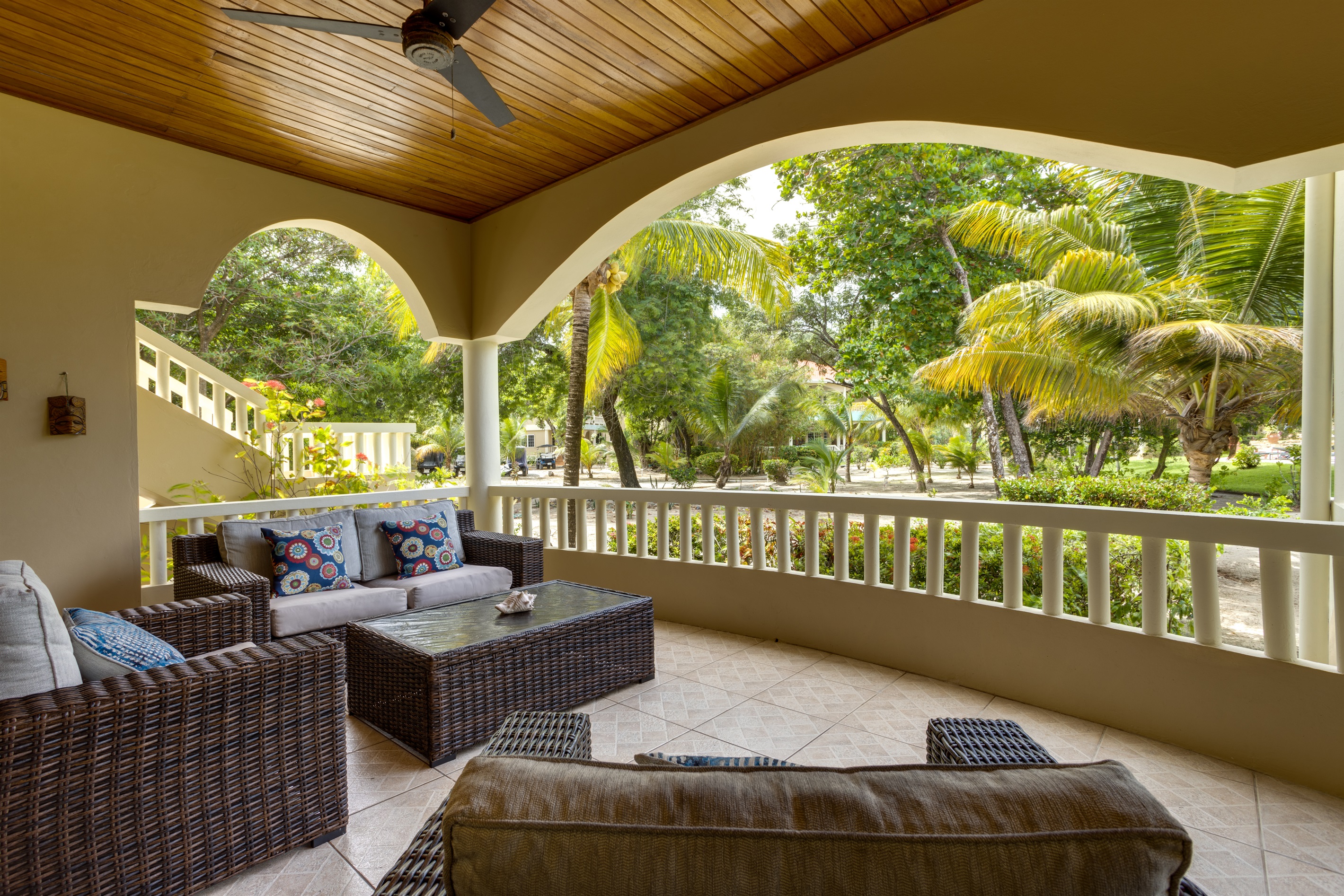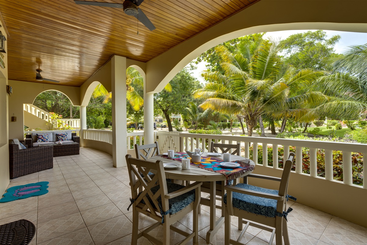 One of the highlights of Los Porticos 3A is the stunning view it offers. From the living area and the outdoor patio, you can take in the lush garden, the inviting pool, and the sparkling Caribbean Sea. The outdoor space is a true sanctuary, featuring a dining area where you can enjoy meals al fresco, as well as plenty of seating for lounging and soaking up the sun. The garden’s tropical landscaping adds to the sense of tranquility, while the sound of the waves in the distance provides a soothing backdrop.