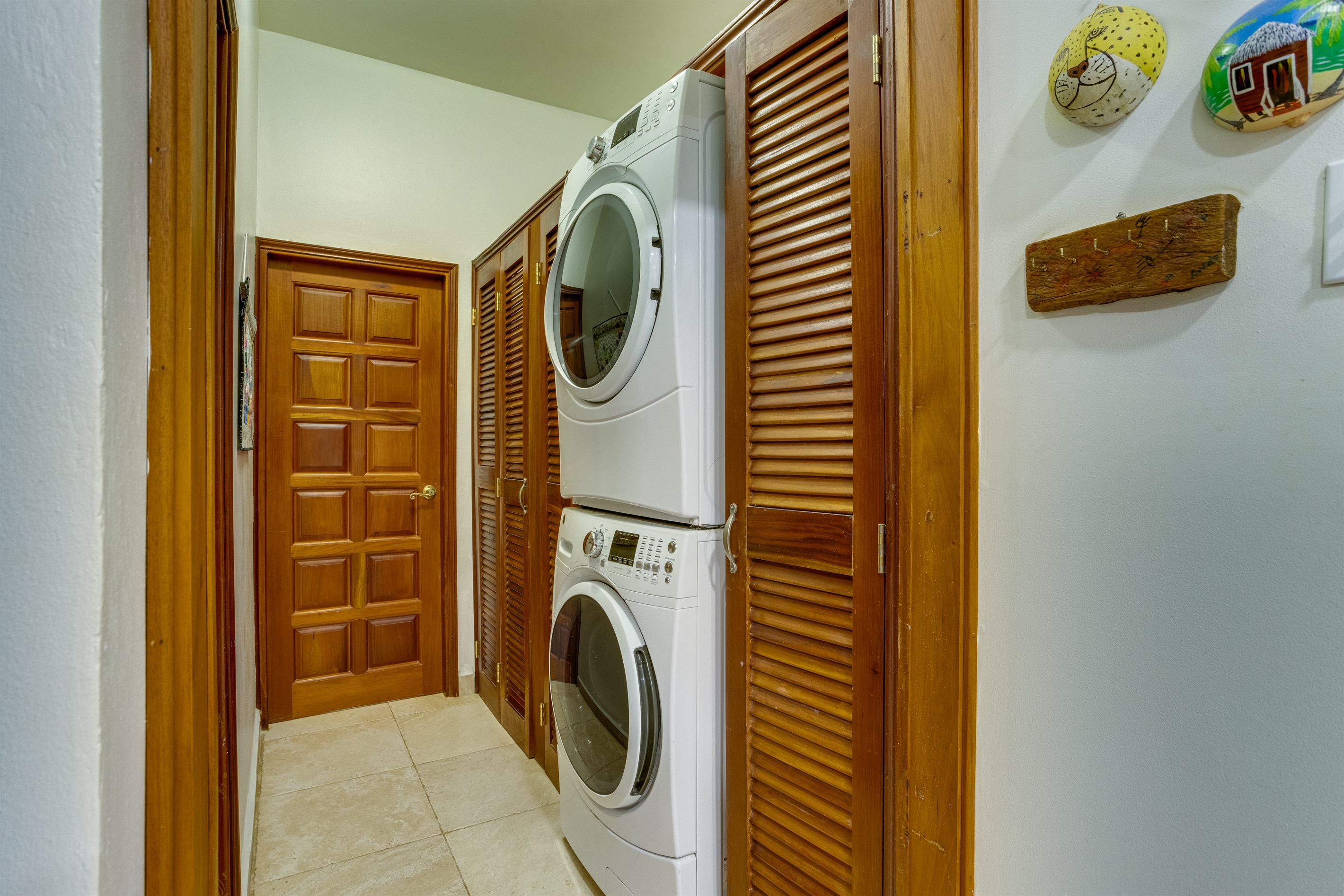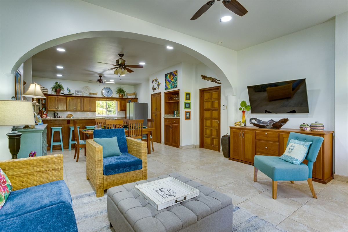 The living area is designed with both comfort and style in mind. It features plush seating and a Smart TV, making it the ideal spot for movie nights or catching up on your favorite shows. The villa is fully air-conditioned to ensure a cool and comfortable environment, no matter the time of year. And with a washer and dryer included, you'll have the convenience of doing laundry right in your own space.