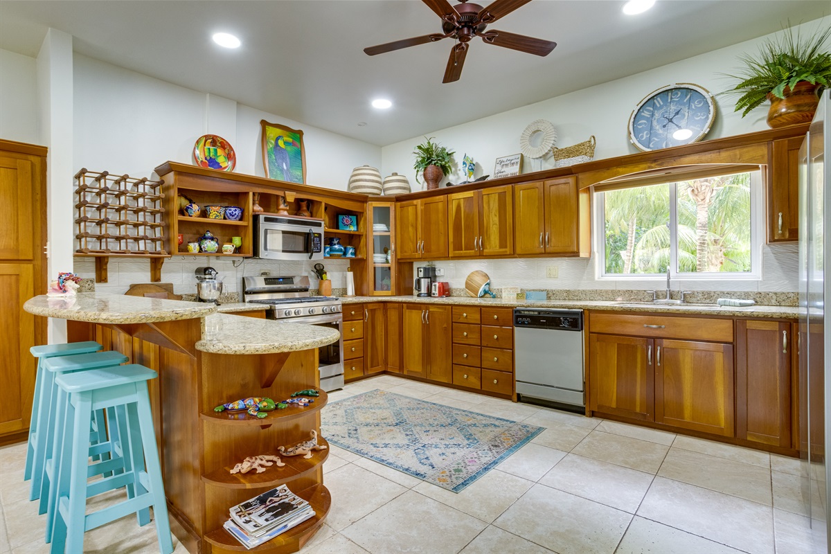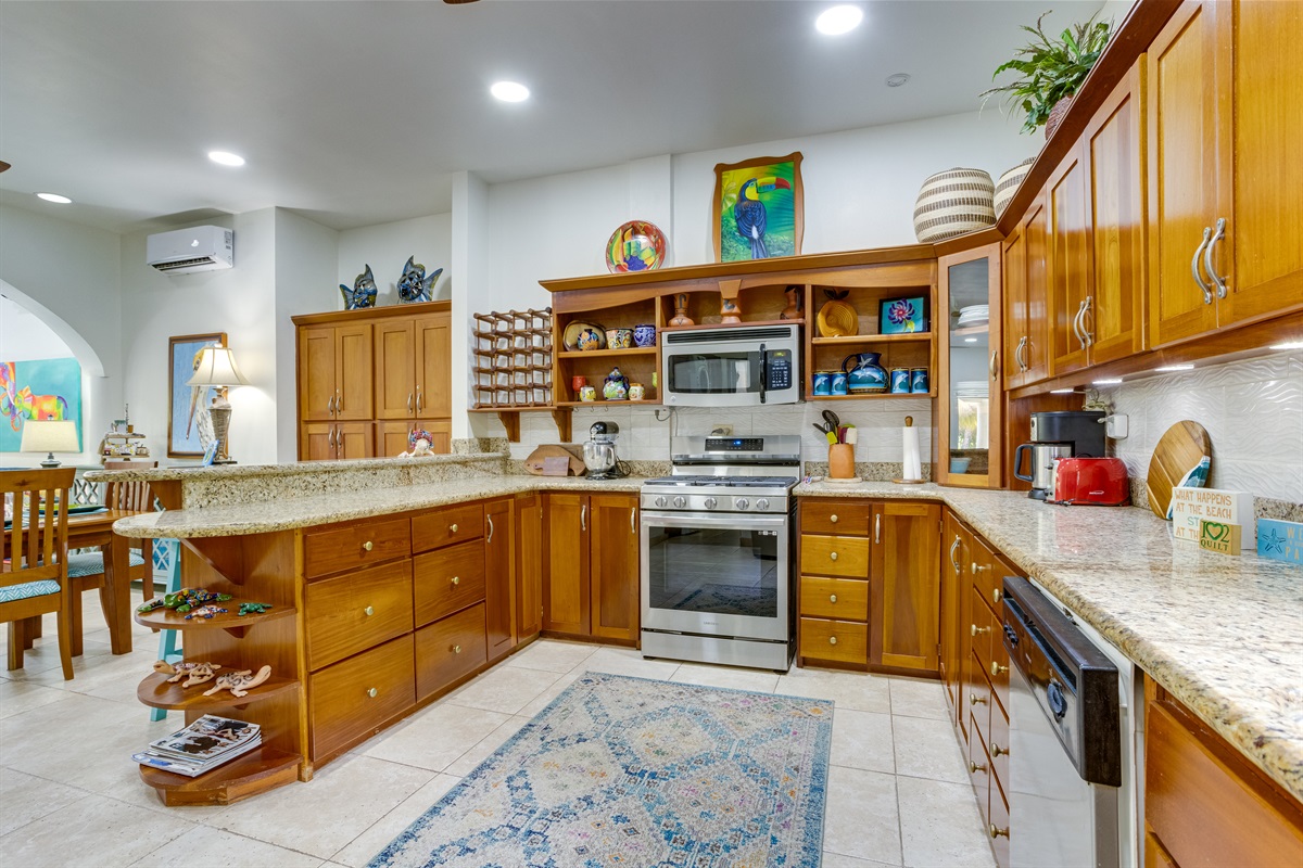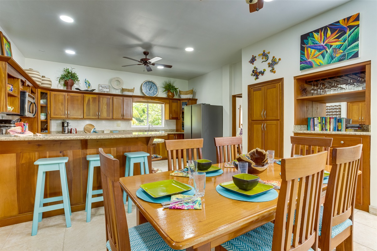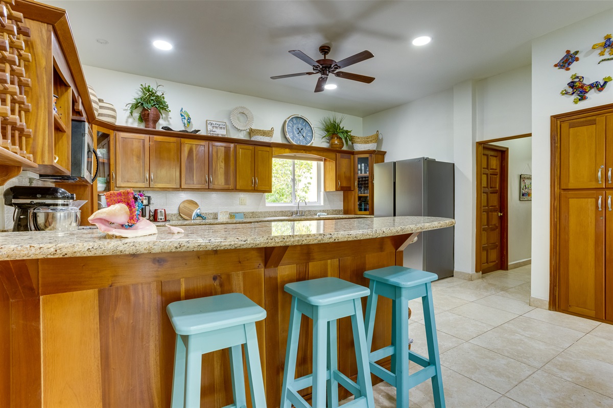 The villa boasts a fully equipped, state-of-the-art kitchen with modern appliances that cater to all your culinary needs. Whether you're whipping up a quick breakfast or preparing a gourmet dinner, you'll have everything you need at your fingertips. The kitchen includes a large refrigerator, stove, microwave, dishwasher, and coffee maker, along with a toaster, freezer, blender, and kettle. You'll also find a full set of dishes and utensils, pots and pans, baking sheets, and wine glasses—perfect for enjoying a meal at the elegant dining table or on the spacious outdoor patio.