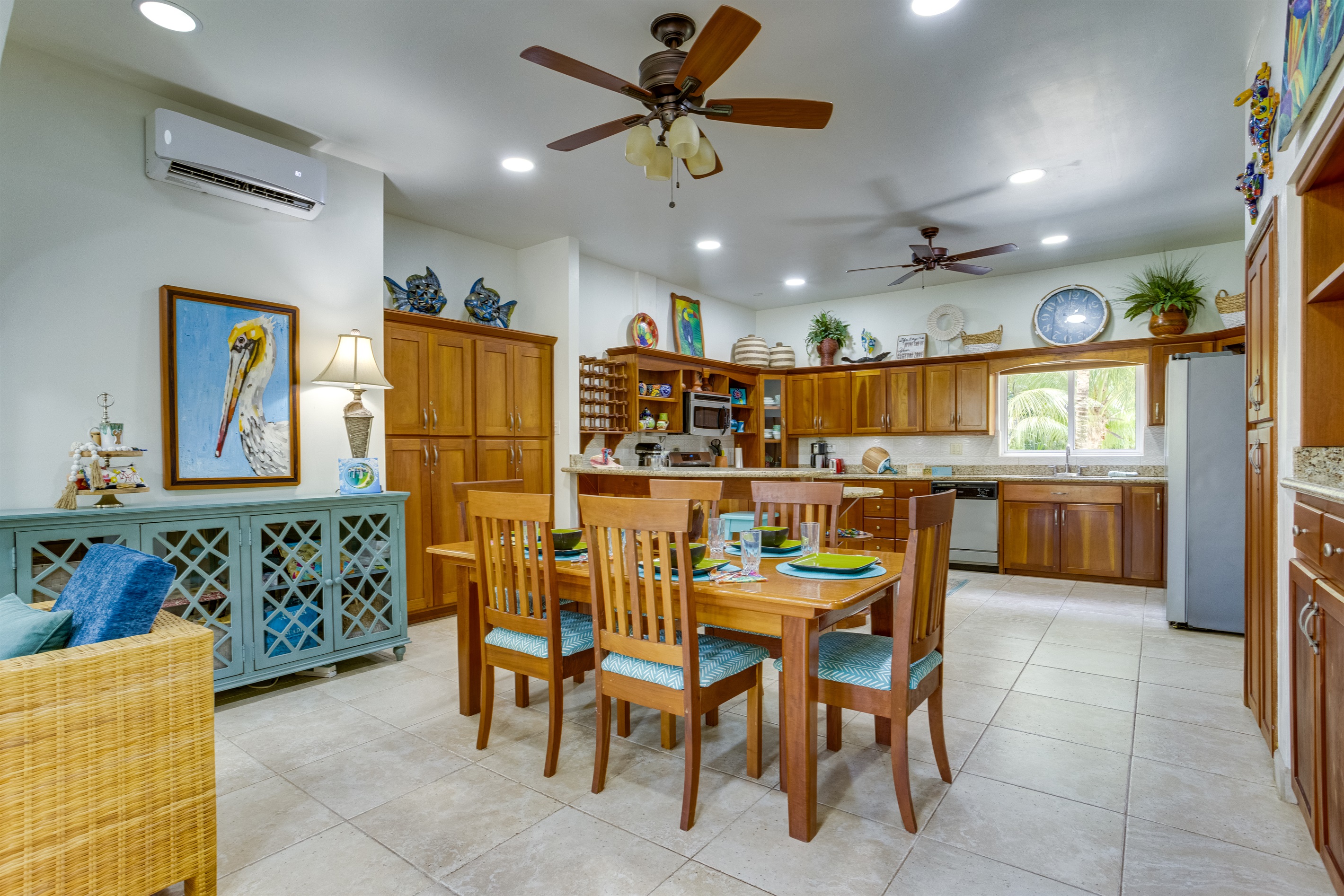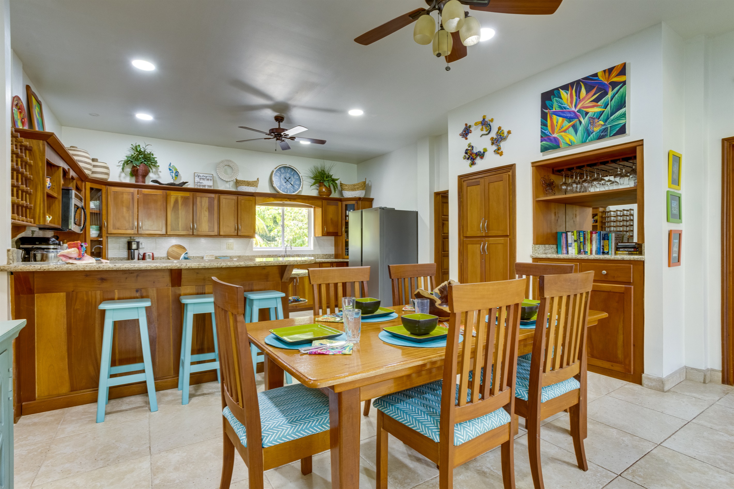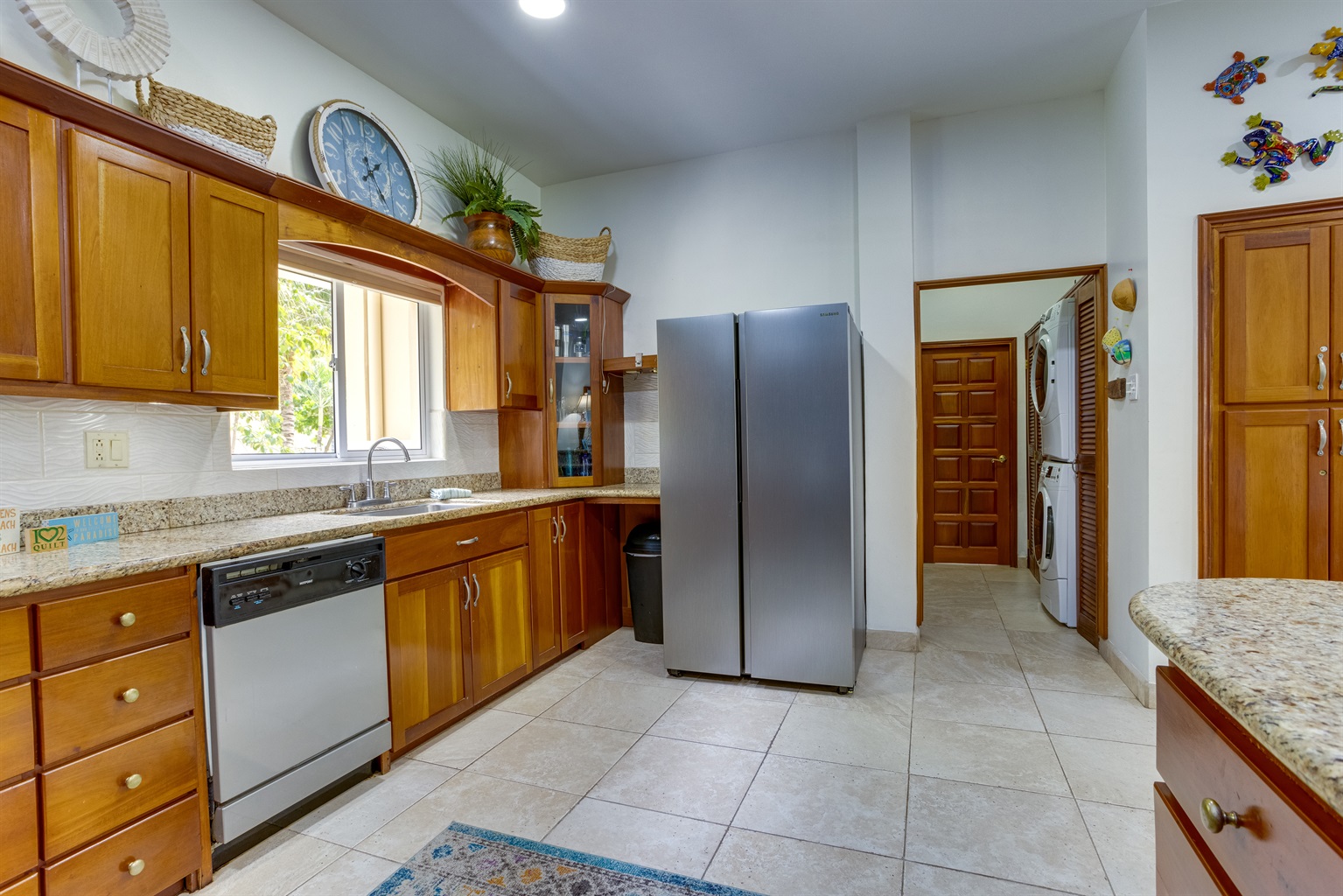 The villa boasts a fully equipped, state-of-the-art kitchen with modern appliances that cater to all your culinary needs. Whether you're whipping up a quick breakfast or preparing a gourmet dinner, you'll have everything you need at your fingertips. The kitchen includes a large refrigerator, stove, microwave, dishwasher, and coffee maker, along with a toaster, freezer, blender, and kettle. You'll also find a full set of dishes and utensils, pots and pans, baking sheets, and wine glasses—perfect for enjoying a meal at the elegant dining table or on the spacious outdoor patio.