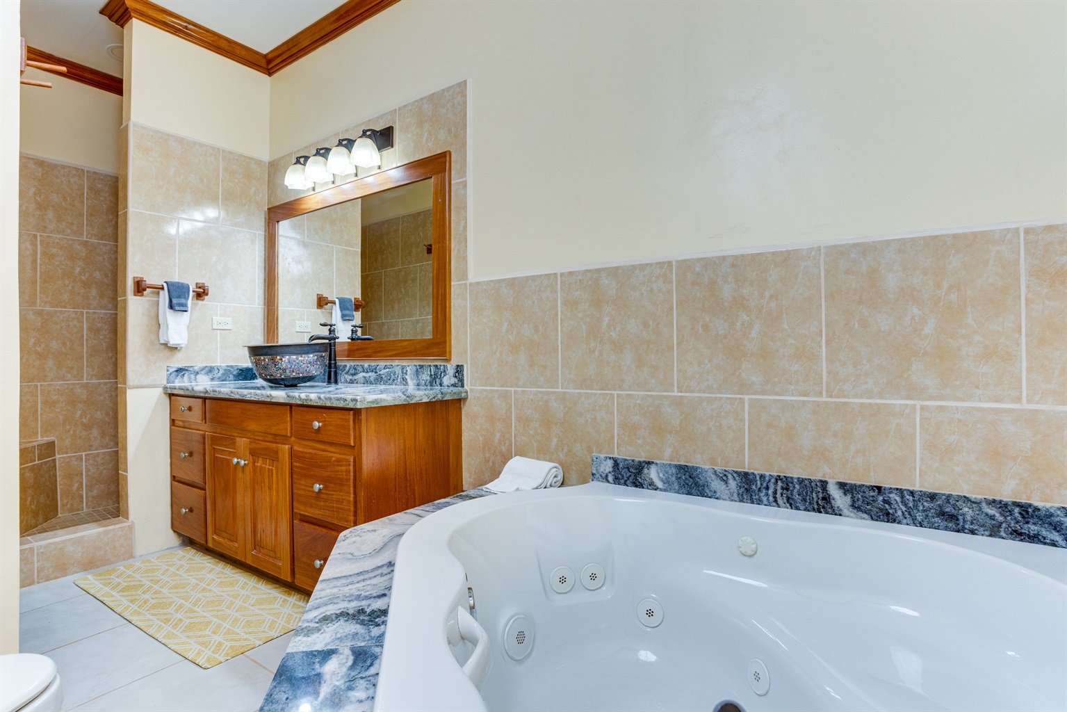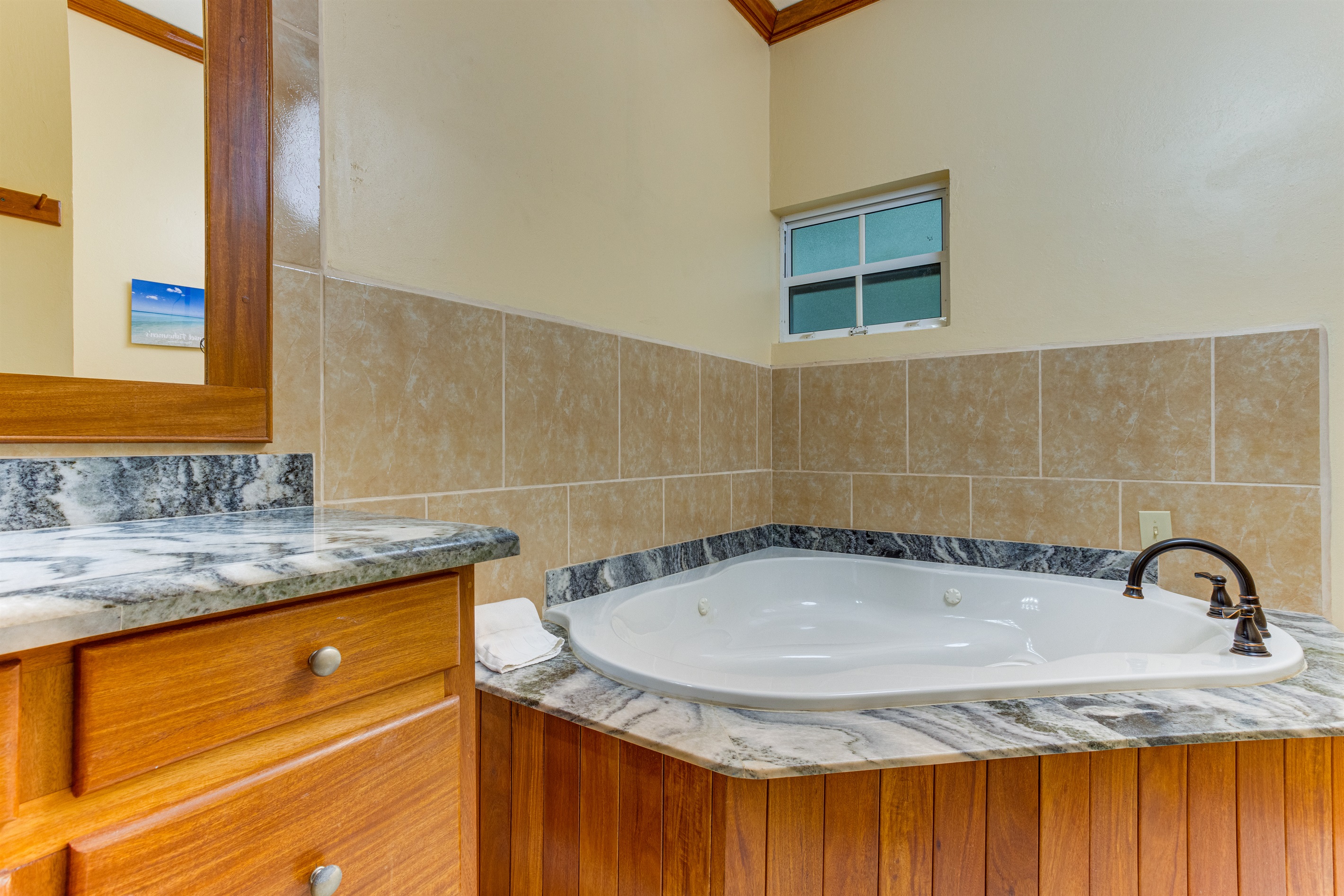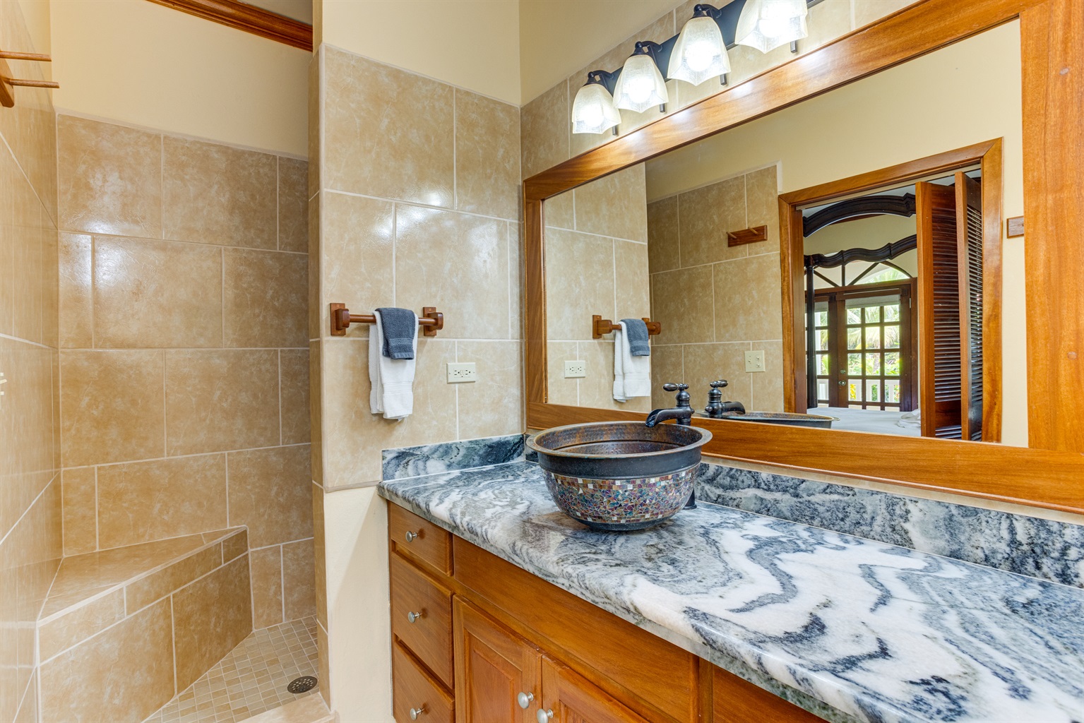 Step into the fully equipped kitchen, where you will find a blender, dishwasher, new cutlery, dinner sets, and a wine cooler. The condo is fully air-conditioned and includes a washer and dryer for your convenience. The beautifully designed bathroom is perfect for two, providing a relaxing retreat after a day of adventure.