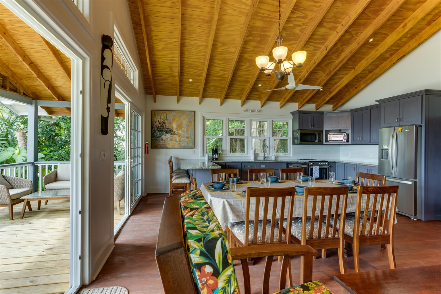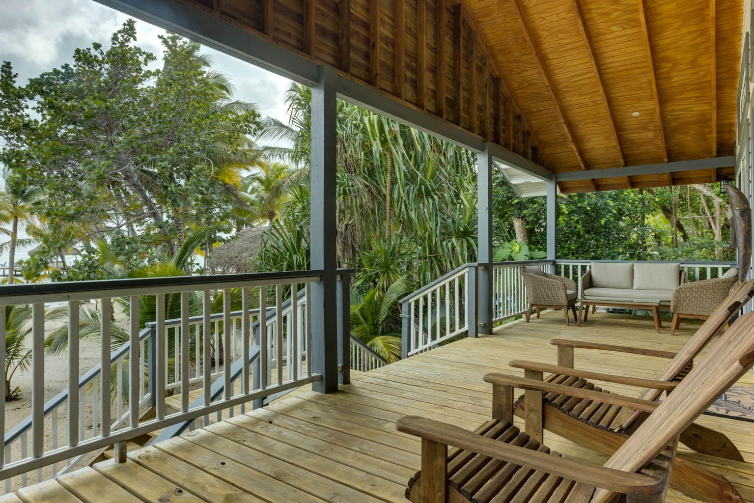 Outdoors you can soak in this tropical and beach experience, relaxing on the wrap-around covered, elevated and shaded deck with a 270 sq ft front porch offering sea views, and a 296 sq ft side porch overlooking the forest garden. It's the perfect spot to dine or unwind with the refreshing sea breeze.