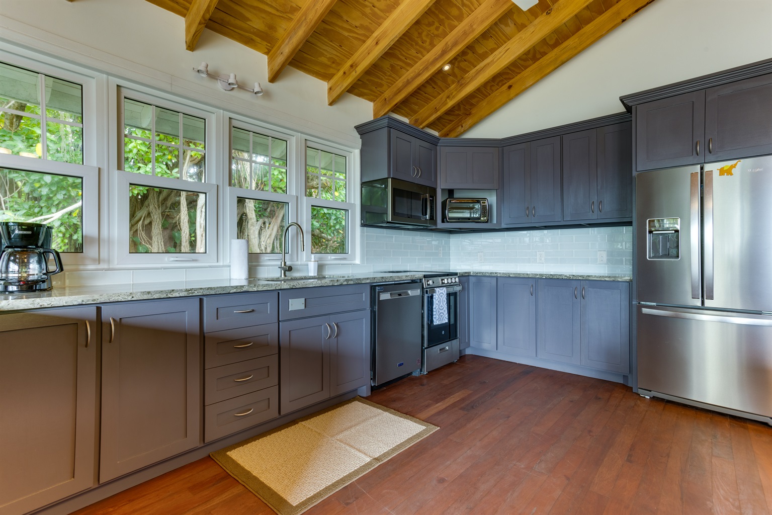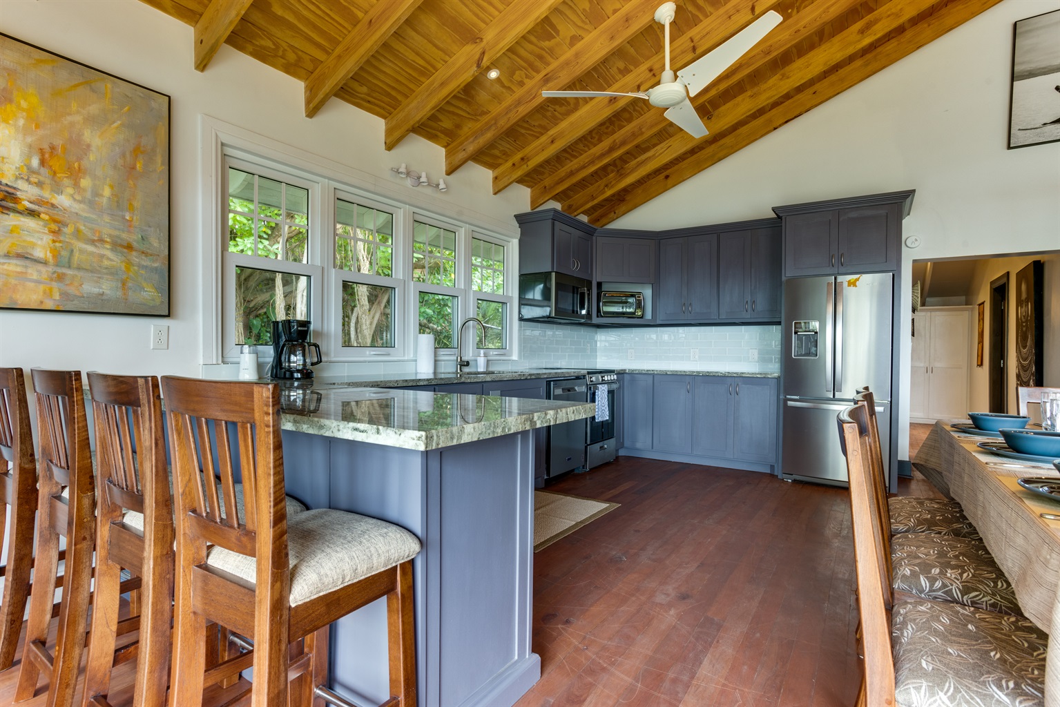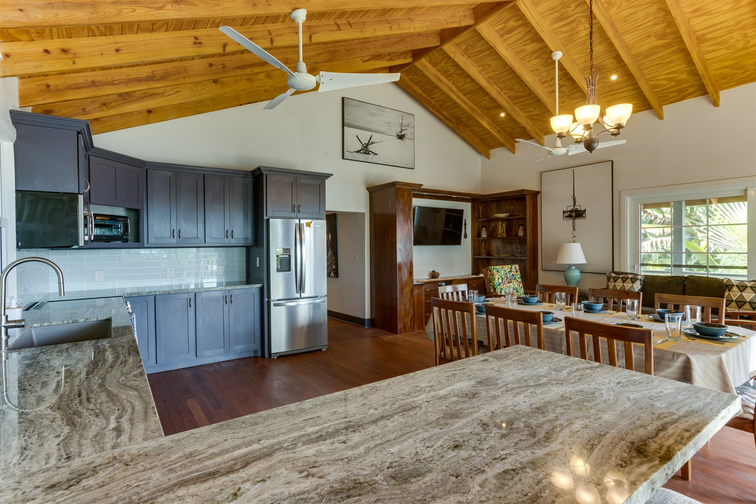 The house has an open living room and kitchen area, highlighted by a vaulted ceiling, ACs in the bedrooms, ceiling fans in each room, granite countertops, hardwood floors, a bathroom, and shared washer/dryer and kayaks. HD streaming TV and free WiFi is available.