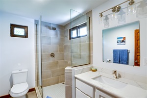 The main deck is elevated and accessible via stairs from the beach level. It is large enough that one can easily spend all day just lounging on the deck. Connected to the main deck are three separate small houses, which consist of two bedrooms with AC and a living room with kitchen which is also fully airconditioned. The bedrooms are spacious with queen and double size beds and individual bathrooms. Both bedrooms have large windows, allowing views of the lush vegetation, beach, and Caribbean sea as well as AC for a cool nights rest. The living room is a large common space area with state of the art kitchen and large doors that flow straight onto the large outside deck. From the living room, you have access to the stairs leading to the roof top deck, from where you can oversee the entire peninsula and enjoy sunset cocktails. On the beach level is an additional studio with a kitchenette, that can serve as a third bedroom. This studio also has AC for your comfort. The studio has a porch that is leveled with the beach, steps away from the water.