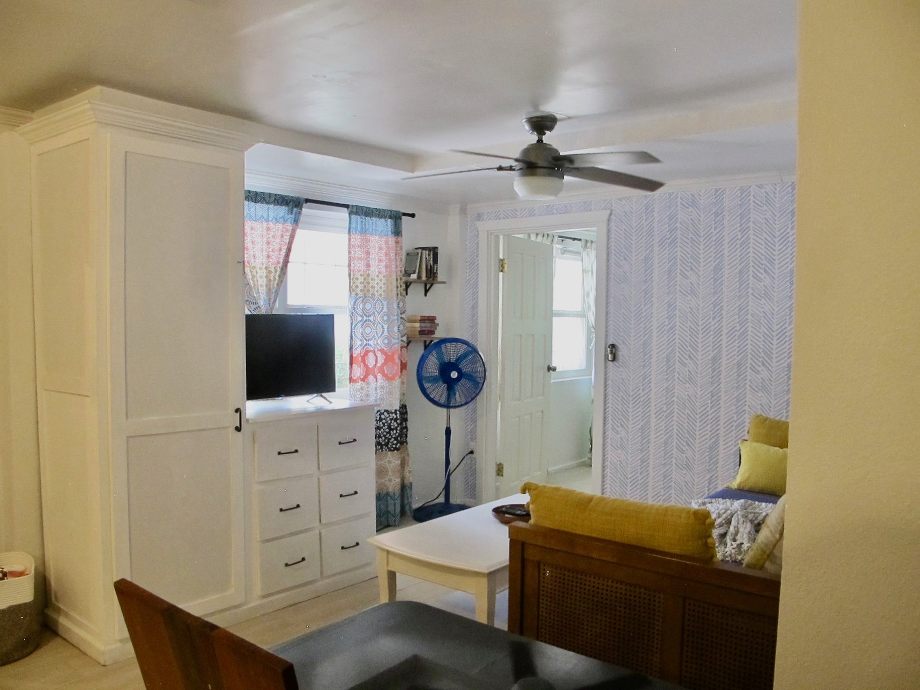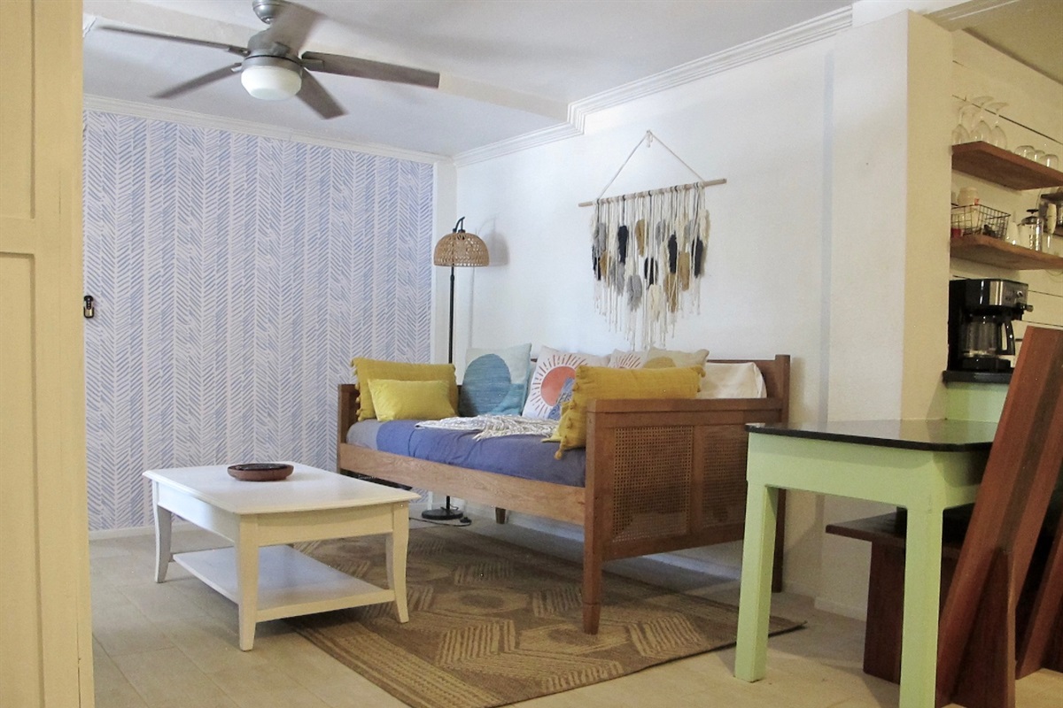 The bedroom offers a ceiling fan and large wardrobes. The main area kitchen/living also offers a ceiling fan and air conditioning which easily spreads to the bedroom. All linens and beach towels are included as well as starter toiletries.